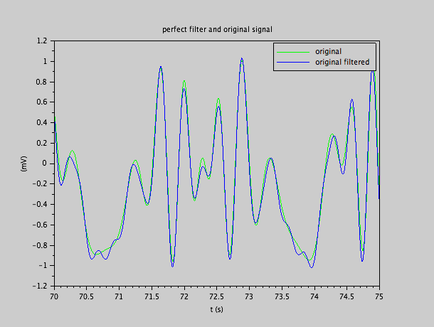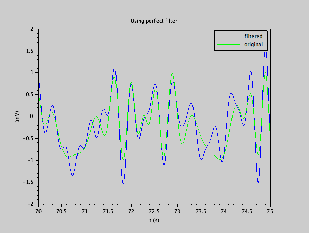 On pourrait se demander pourquoi s'embrouiller avec des filtres approximatifs, si le filtre parfait est possible (comme nous avons fait pour produire les illustrations). Le problème est que pour pouvoir appliquer le filtre parfait, il faut déjà avoir le signal en entier. Ensuite, il faut en faire la transformée de Fourier, limiter cette transformée à la bande passante (ici donc 0-4 Hz), et prendre la transformée inverse: ce sera le résultat du filtre parfait appliqué au signal. C'est ce que nous avons fait pour calculer la sortie du filtre parfait.