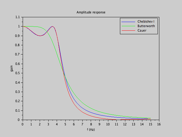 Les propriétés classiques sont reconnues: le filtre Butterworth a la plus lente coupure, mais a la réponse la plus plate dans les basses fréquences. Le filtre Tchebychev de type I a son oscillation permise de 10% dans la bande passante, mais a une coupure bien plus franche. Le filtre Cauer (elliptique) est encore plus raide, mais le filtre Cauer remonte dans la bande coupée, tandis que le filtre Tchebychev continue de descendre.