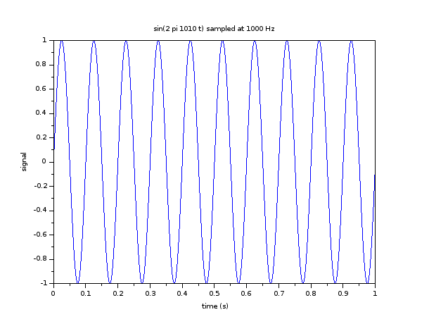 Dans l'exemple qui suit, nous allons utiliser une fréquence d'échantillonnage de 1 KHz.  Quand nous échantillons un signal sinus avec une fréquence de 1010 Hz, alors le graphique des échantillons successives se présente comme:
