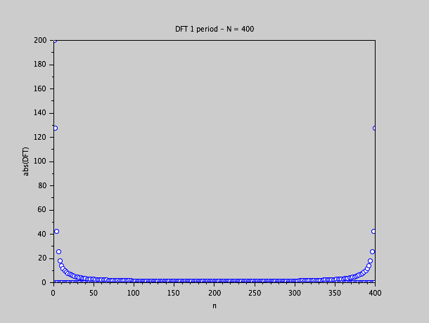 Les valeurs sont 5 fois plus grands que dans le cas d'une simple période avec 400 échantillons à la même fréquence d'échantillonnage.  C'est normal, car il faudra normaliser par N/2, et N est 5 fois plus grand aussi.