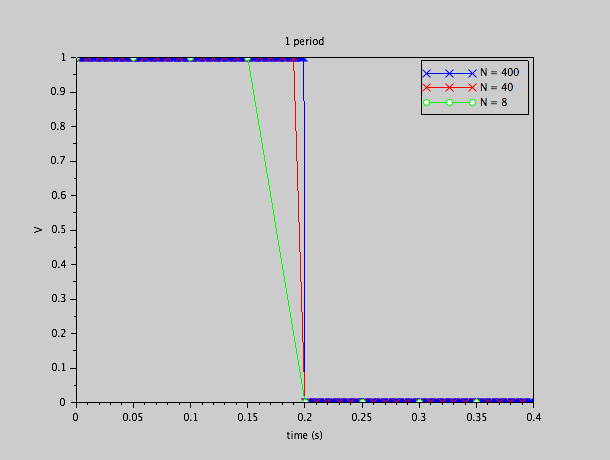 Nous observons déjà un effet: bien que la fonction d'origine monte à 1 a t = 0 exactement, et descend à 0 à t = 0.2 exactement, les échantillons sont tels que la montée et la descente apparaissent un peu plus tôt.  Cela donnera un décalage de phase dans les coefficients de Fourier, comme nous allons le constater.