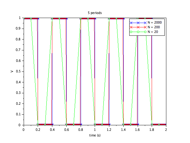 Finalement, nous allons illustrer ce qui se passe si nous prenons plusieurs périodes du signal dans la fenêtre.  Nous allons prendre notre même fonction carré, mais notre fenêtre sera 5 périodes, à savoir 2 secondes.  Nous allons considérer N = 2000, N = 200, et N = 20.