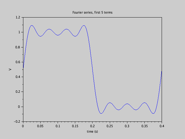 Si nous prenons les 5 premiers termes de la série de Fourier, cela donne une fonction qui est une approximation de notre fonction carré.  Nous pouvons nous imaginer que si nous ajoutons de plus en plus de termes de la série, le résultat convergera bien vers le signal rectangulaire d'origine: