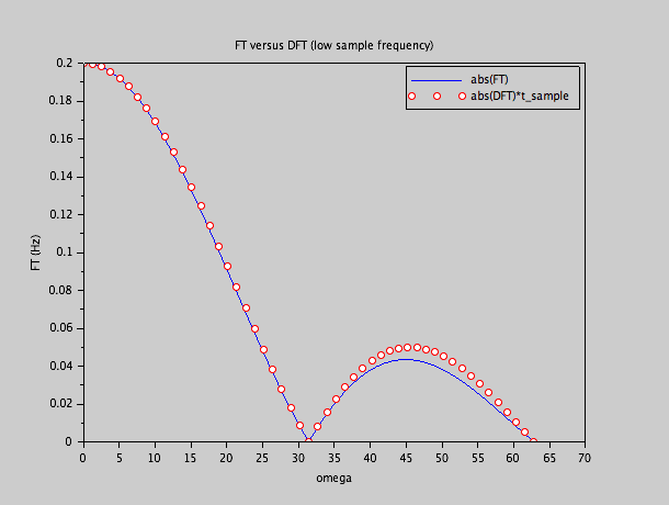 En échantillonnant notre fonction à une fréquence de 500 Hz, nous aurons N = 2500, dont 100 seront 1, et 2400 seront 0.  Il faut se souvenir que cette fois, nous ne considérons pas un signal périodique, mais un signal fini, qui est zéro en dehors de la fenêtre de temps.  La fenêtre étant 5 secondes, la grille sur laquelle nous allons échantillonner la transformée sera 0.2 Hz, ou 1.256 rad/s.  Nous allons comparer les valeurs absolues de la DFT normalisés avec un facteur 0.002 s (la fréquence d'échantillonnage) sur une partie de l'axe omega, avec la valeur absolue de la transformée théorique: