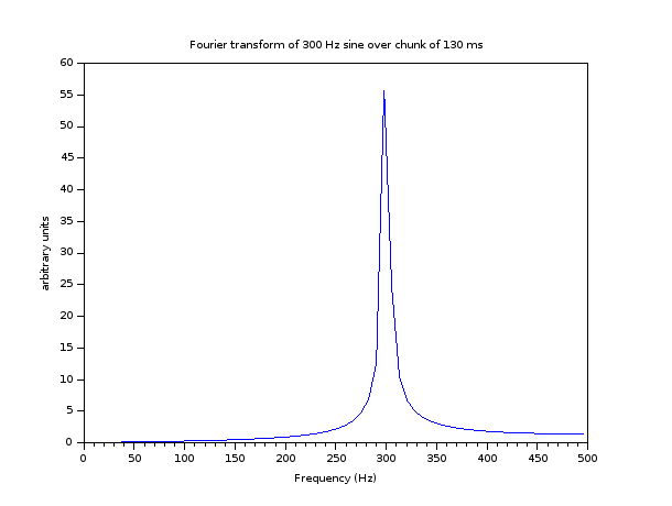 Par contre, si nous faisons la même chose, mais avec une fenêtre de 131 ms, ce qui impose une grille de fréquences qui sont des multiples de  7.63358... Hz, 300 Hz ne se trouve pas sur la grille, et nous observons la fuite spectrale: