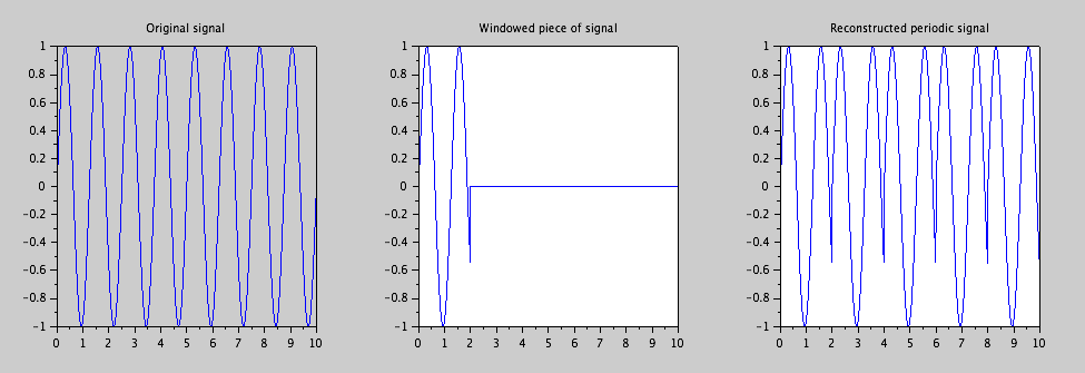 Comme toute partie du signal peut influencer toute partie de la transformée de Fourier, il est normal que se limiter à un morceau fini ne pourra jamais nous donner la vraie transformée de Fourier, car nous ignorons la partie du signal en dehors du morceau qu'on étudie.  Mais nous allons bien sûr prendre comme hypothèse que la partie que nous observons est représentatif pour le reste du signal.  Une façon de faire cela, est de prendre l'hypothèse que la partie finie qu'on décide d'observer, sera répétée infiniment en dehors de la fenêtre d'observation.  C'est mieux que de faire l'hypothèse que le signal sera zéro en dehors de cette fenêtre.