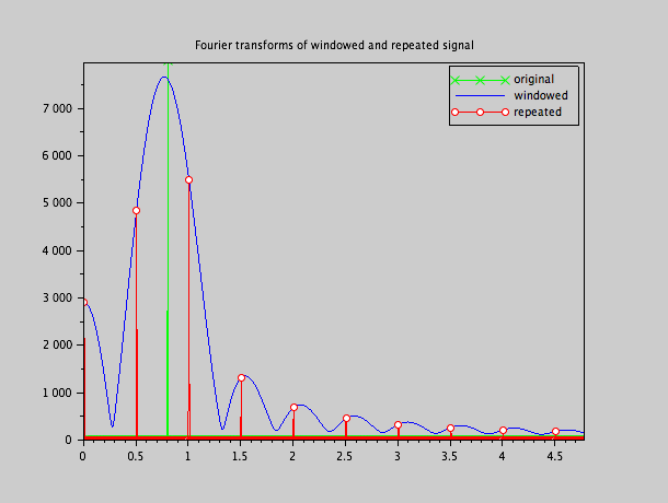 En réalité, nous sommes rarement dans le cas du signal répété égal au signal d'origine, qui était le seul et unique cas dans lequel nous pouvions estimer la transformée de Fourier (devenu une série de Fourier limitée) correctement, car le signal qui nous intéresse peut très bien ne pas être périodique et donc contenir des composantes fréquentielles qui ne sont pas un multiple d'une fréquence Fw.  Dans ce cas, la fenêtre finie va "disperser" le contenu spectral de chaque composante du signal d'origine selon la transformée de la fenêtre, à savoir la fonction sinc.   La répétition d'un bout fini de signal pour former un signal périodique artificiel sera alors représenté par une série de Fourier dont les coefficients sont l'échantillonnage de cette transformée convoluée avec la fonction sinc.  Comme les composantes dans le signal d'origine ne sont pas alignées à la grille des multiples de Fw les fonctions "sinc" centrées sur ces composantes n'ont pas leurs zéros sur la grille, et vont donc contribuer à la valeur des coefficients proches et même relativement loin de la composante d'origine.   Cela implique donc: