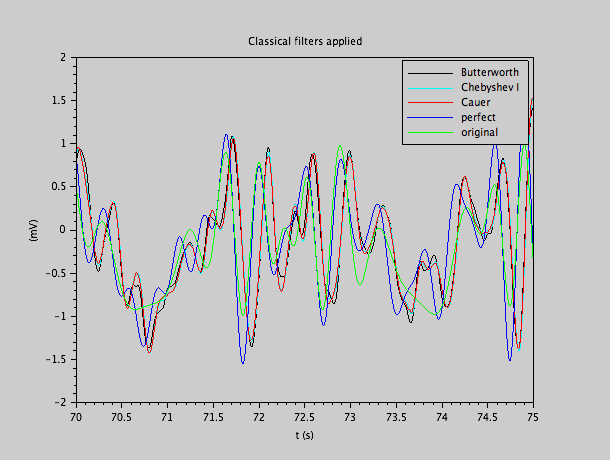 Un vrai filtre doit traiter le signal pendant qu'il arrive dans la plupart des cas. Il ne peut pas attendre la fin du signal pour commencer à produire le signal de sortie. Nous avons implémenté une simulation de 3 filtres classiques: un filtre Butterworth coupant à 4 Hz, un filtre Tchebychev de type I coupant à 4 Hz avec une erreur permise de 10% dans la bande passante, un filtre Cauer coupant à 4 Hz, aussi avec une erreur d'amplitude permise de 10% dans la bande passante, et une suppression d'au moins 100 dans la bande supprimée. Nous nous limitons à des filtres d'ordre 3.
