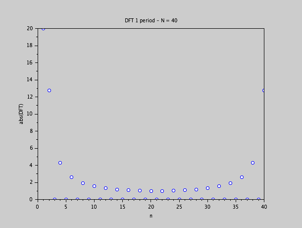 Si nous passons sur notre suite de 40 échantillons au lieu de 400, et nous montrons les valeurs absolues de la DFT: