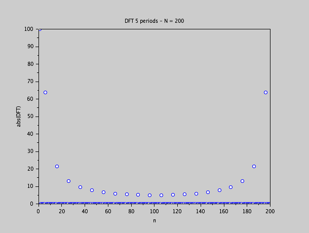 Ces valeurs ne sont pas identiques aux valeurs théoriques, mais elles sont strictement égales aux valeurs trouvés avec une période et N = 40.  C'est très important de se rendre compte: une période à N = 40 est parfaitement équivalent à 5 périodes et N = 200, sauf pour le fait que nous ajoutons 4 zéros inutiles entre chaque valeur utile et qu'il faut diviser par 100 au lieu de diviser par 20 pour retrouver les coefficients de Fourier.