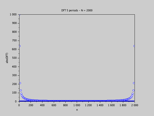 Les valeurs sont 5 fois plus grands que dans le cas d'une simple période avec 400 échantillons à la même fréquence d'échantillonnage.  C'est normal, car il faudra normaliser par N/2, et N est 5 fois plus grand aussi.