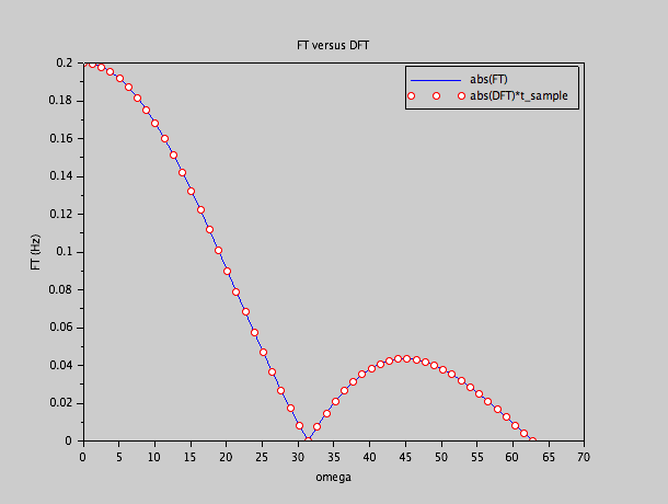 En échantillonnant notre fonction à une fréquence de 500 Hz, nous aurons N = 2500, dont 100 seront 1, et 2400 seront 0.  Il faut se souvenir que cette fois, nous ne considérons pas un signal périodique, mais un signal fini, qui est zéro en dehors de la fenêtre de temps.  La fenêtre étant 5 secondes, la grille sur laquelle nous allons échantillonner la transformée sera 0.2 Hz, ou 1.256 rad/s.  Nous allons comparer les valeurs absolues de la DFT normalisés avec un facteur 0.002 s (la fréquence d'échantillonnage) sur une partie de l'axe omega, avec la valeur absolue de la transformée théorique: