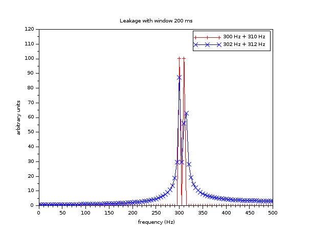 Nous illustrons cet effet avec deux signaux qui seront tous les deux échantillonnés à 1 KHz, avec une fenêtre de temps de 200 ms, ce qui implique un Fw de 5 Hz.  Un signal composé d'un sinus de 300 Hz et un sinus de 310 Hz aura deux composantes sur la grille.  Un deuxième signal, avec une composante à 302 Hz et une autre composante à 312 Hz, sera analysé de la même façon.  Remarquez que dans les deux cas, les deux composantes diffèrent de 10 Hz.