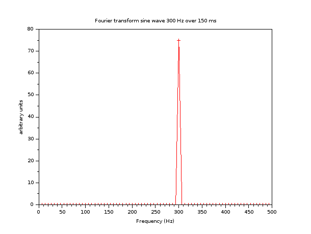 Par contre, si notre fenêtre fait 150 ms, 300 Hz se trouve bien sur la grille des multiples de 6.6667 Hz, et le spectre est estimé correctement: