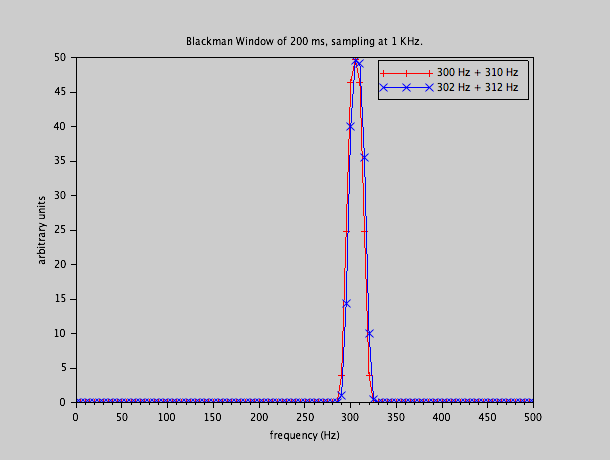 L'effet est frappant !  Il n'y a presque pas de différence entre les spectres des deux signaux, sauf que le signal contenant 302 Hz et 312 Hz donne un spectre très légèrement décalé vers la droite - comme il se doit.  Il n'y a plus de fuite spectrale importante à grande distance.  Mais sans doute l'effet le plus frappant est que nous avons un seul pic par spectre.  Nous ne distinguons plus le 300 Hz du 310 Hz.  C'est le compromis habituel: la diminution des lobes secondaires à grande distance est compensée par un élargissement du lobe central (et donc une perte de résolution).  La fenêtre rectangulaire a une très bonne résolution spectrale, mais une fuite spectrale terrible.  La fenêtre Blackman est fantastique en ce qui concerne les fuites, mais a une résolution terrible.  D'où le besoin, parfois, d'expertise pour choisir la fonction de fenêtrage de façon judicieuse.  Il n'y a pas de fenêtre universellement meilleur que une autre.  Cela dépend de l'application.