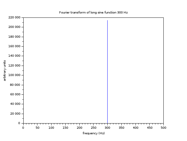 Quand nous échantillons un sinus de 300 Hz et nous prenons une fenêtre de temps très très longue, la transformée de Fourier calculée ressemble très fortement à la Transformée théorique: un pic à 300 Hz (nous ne regardons que les fréquences positives, et nous prenons la valeur absolue de la transformée pour les graphiques):